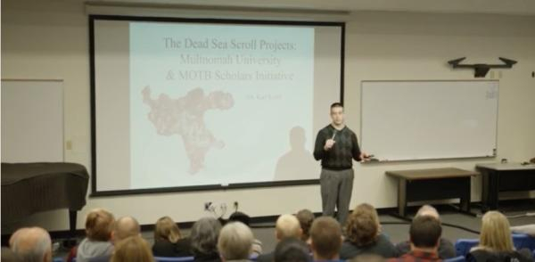 保守福音派院校茅特诺玛大学(Multnomah University)的圣经语言教授库兹(Karl Kutz)讲解圣经博物馆馆藏“死海古卷”,他负责带领团队研究其中三份,《博物馆藏死海古卷残片》第七、八、十一章即该团队的研究成果。