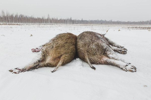 2016年11月26日,黑河小兴安岭一带山林,鄂伦春猎人猎杀的两只野猪。2-3岁的野猪约有200斤,按当时物价约值2000元。猎物通常按各人贡献分配。猎户除自己食用外,还会卖给市场、饭店、游客与商贩。本文图片均为 澎湃新闻记者 周平浪 图