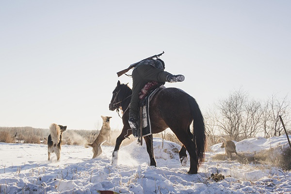 2016年11月24日,小兴安岭猎人营地,鄂伦春族猎人葛春勇翻身上马,准备与同伴带上猎狗出发打猎。鄂伦春是世代打猎的民族,按照政策规定,他是仅剩的保有冬季使用猎枪捕猎权利的十二人之一。