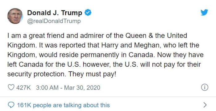 而随着哈里一家搬至美国洛杉矶,他们在美国的安保费用由谁承担也开始成为热议话题。3月29日,美国总统特朗普表示,政府不会为二人的安保费用买单。为此,这对夫妇的发言人称,已经做出私人资助的安保计划。