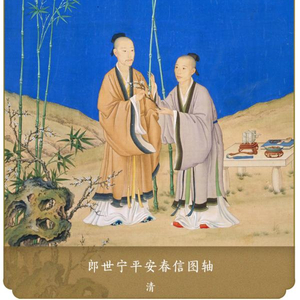 故宫博物院藏有一幅《平安春信图》。画中主角是一长一少两位人物,皆系头巾,身着直裰,长袍宽袖,一副古装打扮。长者手持一截梅枝,递予少年。少年微微躬身,正接过梅枝。背景是几株劲挺的新竹,占据了相当大的画面空间;身前不远处是一树凌寒绽放的梅花——可能正是二人手中梅枝的来源。