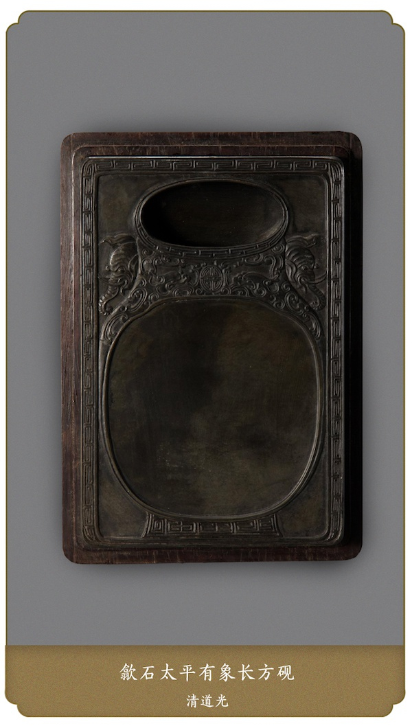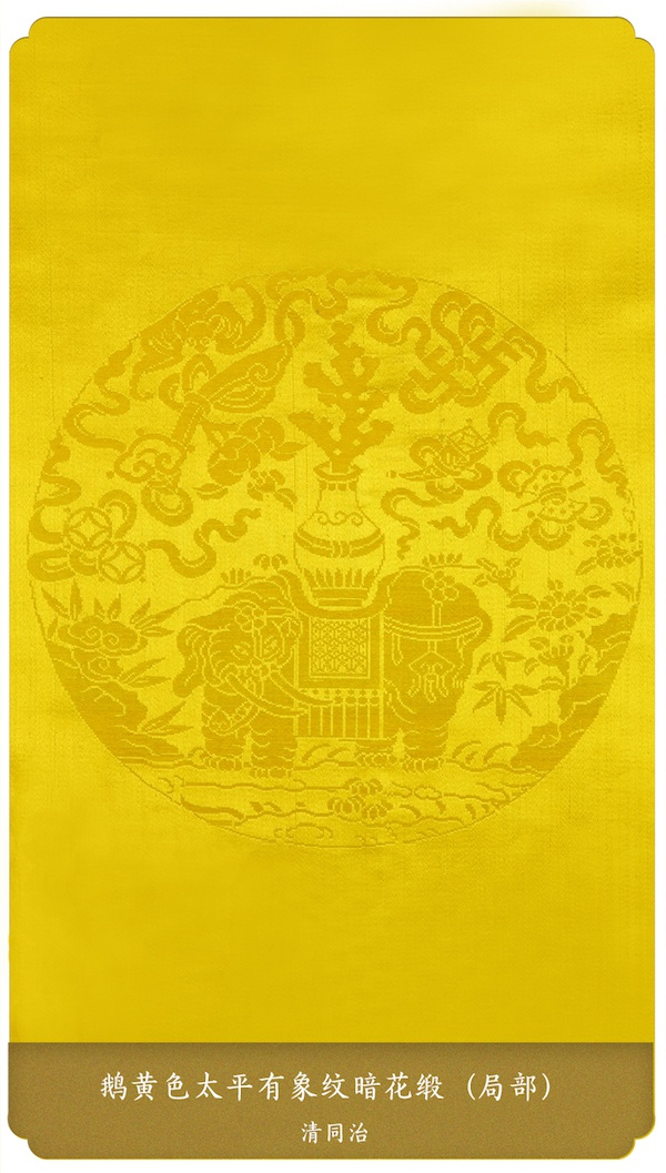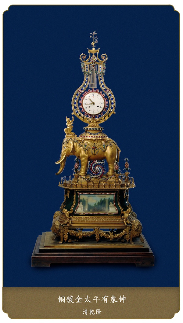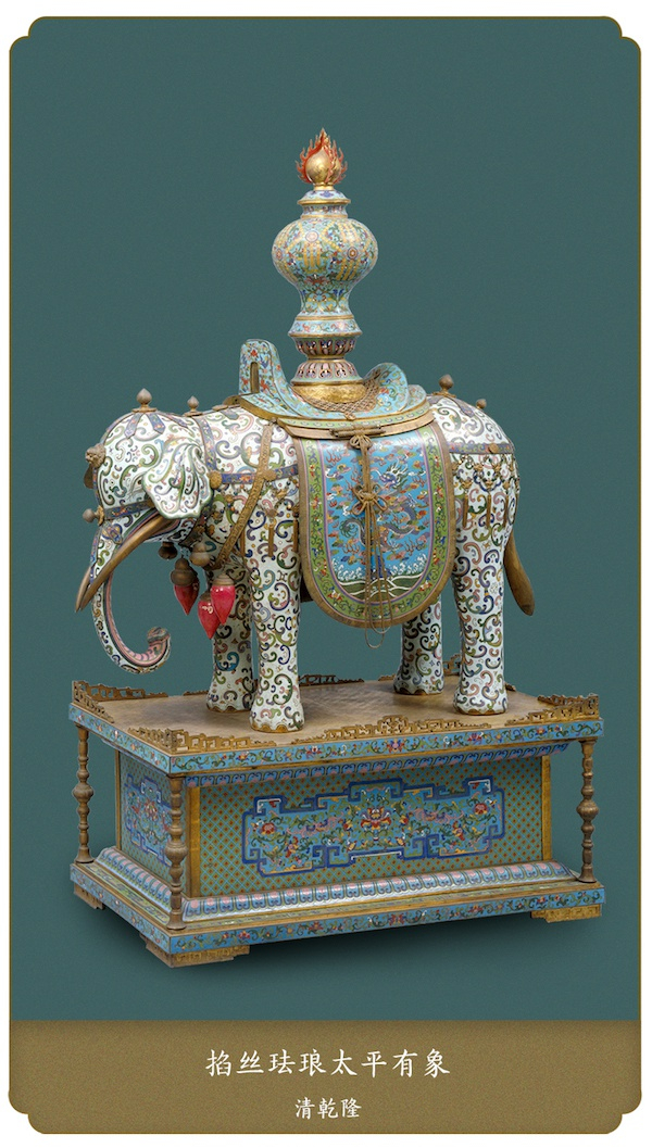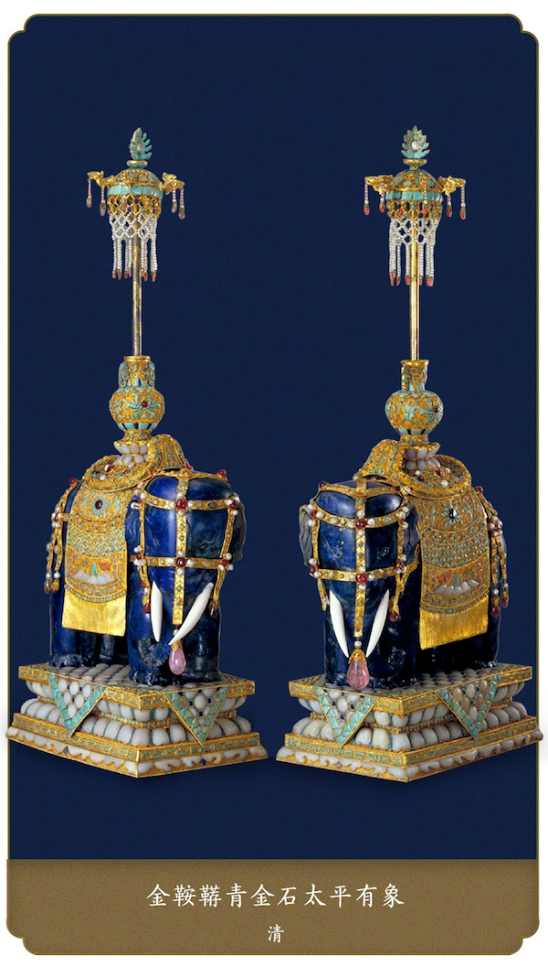 “太平有象”几乎是明清时期最受宫廷欢迎的吉祥主题之一。我们在宝座前的陈设、桌案摆件、钟表、墨砚文具和服装上都能看到它,甚至在首饰上也能看到它。