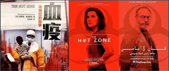 ■ 根据埃博拉故事改编的小说,电影《血疫》封面及海报。美剧《血疫》第一季以六十年代的非洲和八十年代末的美国发现埃博拉病毒和疑似埃博拉病毒为两条主线,讲述了社会各界抗击埃博拉病毒大规模传播的传奇故事。