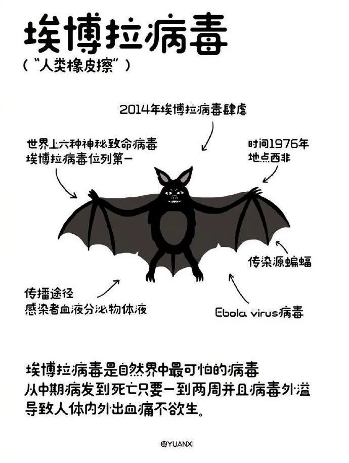 关于埃博拉病毒的来源,多数研究支持大蝙蝠科果蝠是其自然宿主。最初病毒通过野生动物传到人。rVSV-ZEBOV疫苗由2015年在几内亚开展大型试验,目前正在发生疫情的地区得到使用。