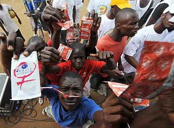 ■ 2009年9月28日,年轻人在首都科特迪瓦阿比让的工作区Yopougon挥舞收到的避孕套,作为西非艾滋病预防计划的一部分。