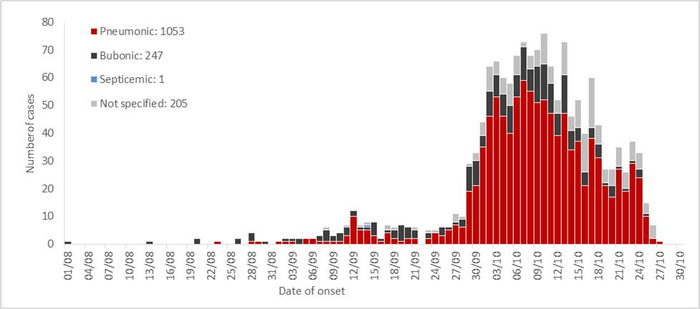 ■ 2017年8月1日至10月30日在马达加斯加报告发生的按临床分类和发病日期分列的确诊、可能和疑似鼠疫病例。
