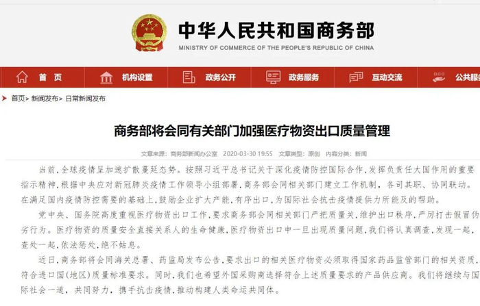 在商务部3月30日发布的消息中已经明确,商务部将会同海关总署、药监局发布公告,要求出口的相关医疗物资必须取得国家药品监管部门的相关资质,符合进口国(地区)质量标准要求。