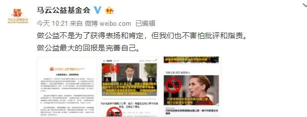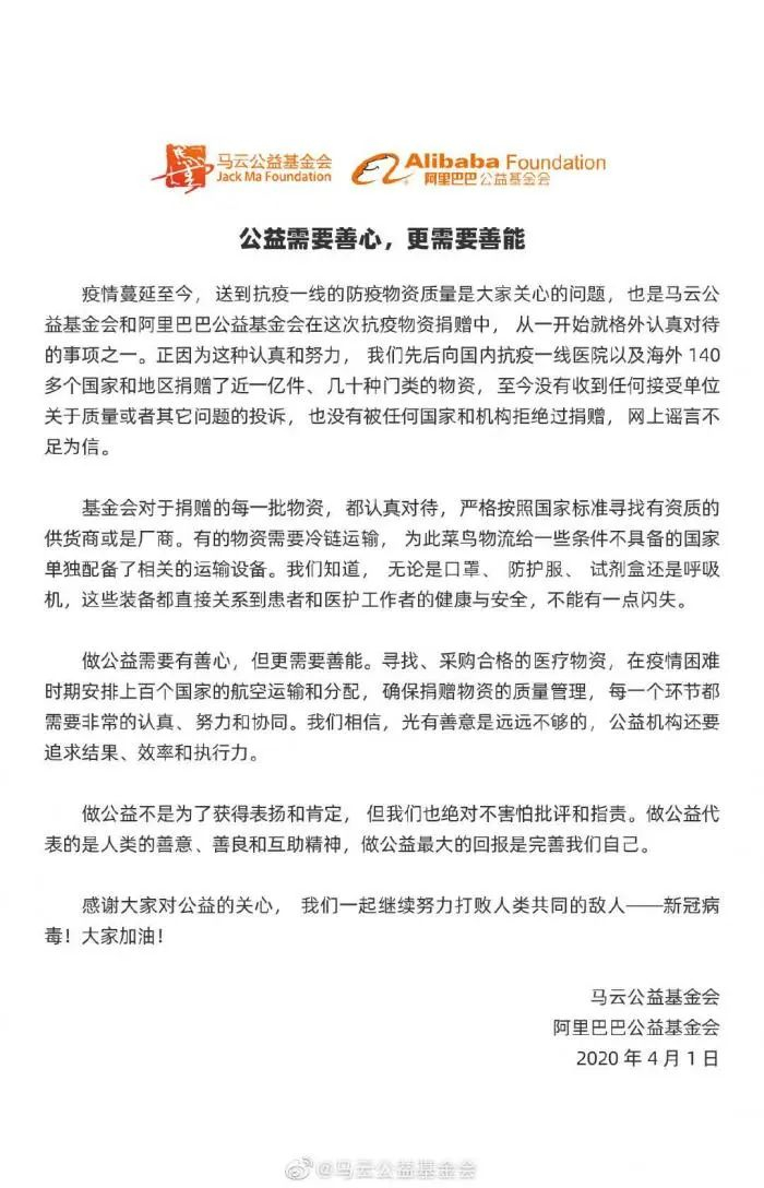 4月1日上午,马云公益基金会回应称做公益不是为了获得表扬和肯定,但我们也不害怕批评和指责。并表示网上谣言不足为信,基金会的每一批物资都严格按照国家标准。