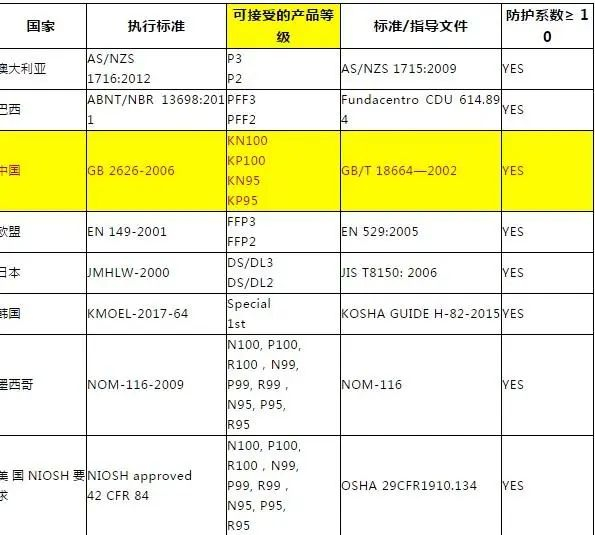 当N95口罩供给不足时,按表中标准生产的口罩,是N95口罩合适的替代品。其中包括采用中国标准GB 2626-2006和GB/T 18664—2002生产的口罩。