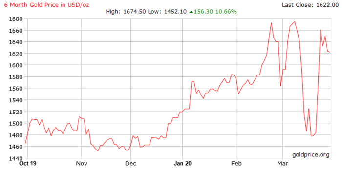从黄金走势图,我们可以清楚地看到自疫情爆发后,黄金价格呈稳步上涨态势,一直涨到近一千七美金每盎司,但随着石油价格的崩盘,股市惨遭血洗,市场缺乏流动性资金,为填补股市保证金,黄金遭到集体抛售,金价也随之剧烈波动,一路探底,作为避险型资产的黄金,如今也在疫情危机下备受打击。