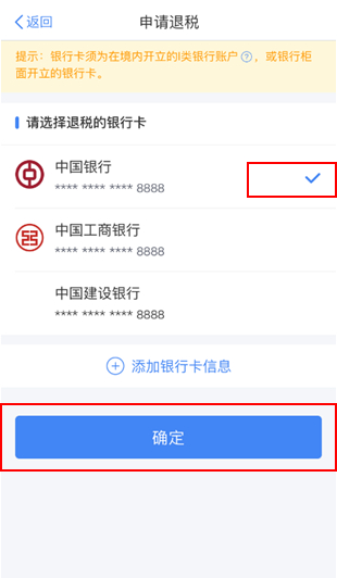 点击【申请退税】后,纳税人需选择退税银行卡。如前期已添加过银行卡,系统将自动带出已填银行卡信息。您需新增,点击【添加银行卡信息】—【确定】。