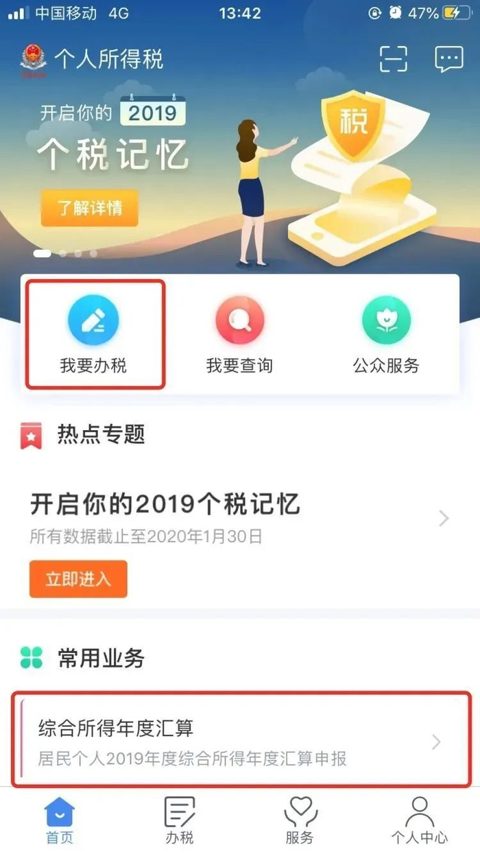 下载【个人所得税 APP】,打开APP后,可从以下入口进入年度汇算: