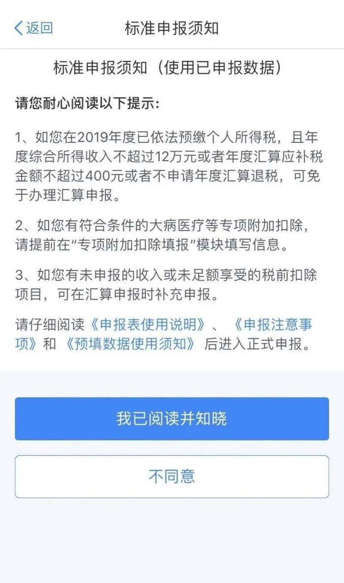 选择【使用已申报数据填写】—【开始申报】后,系统提示【标准申报须知(使用已申报数据)】,点击“我已阅读并知晓”,开始年度汇算申报。