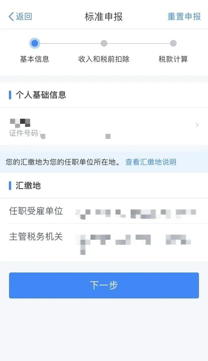 此处需要对个人基础信息、汇缴地、已缴税额进行确认。
