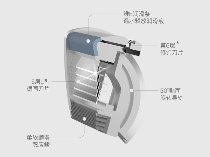 5层德国进口刀片,30°可旋转刀头,完美贴合面部轮廓,一刮到底,刀过须除,不留死角。