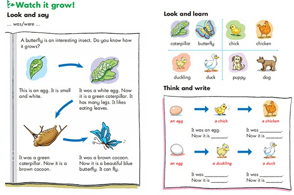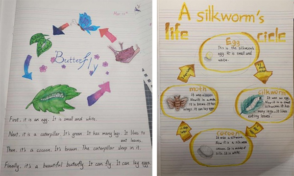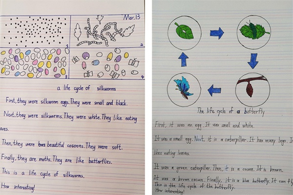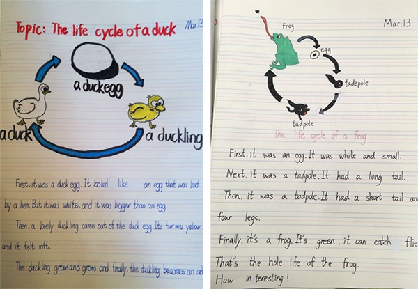 接着,在五年级第二学期第一单元第二课的主要内容中,老师要求学生根据参考课文,自己创作,描写一种动物的生长周期,图文并茂。
