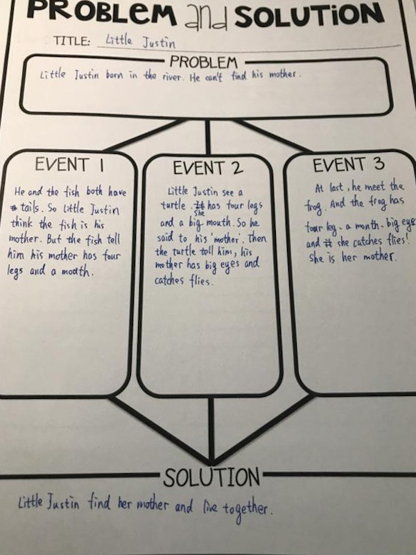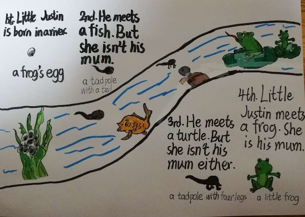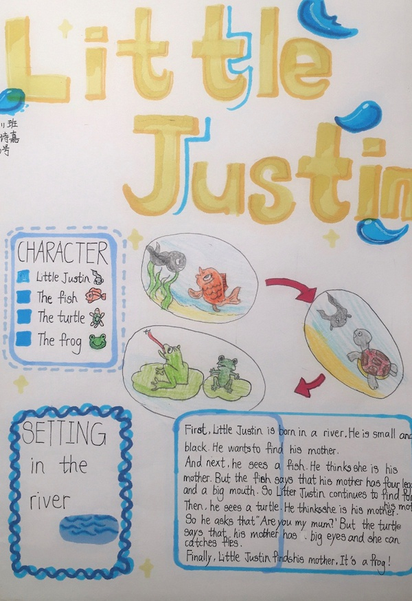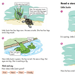 牛津上海版五年级第二学期第一单元第二课的预习内容中讲述了Little Justin的故事,Little Justin是个小蝌蚪,课文分四步讲述了它成长的故事,课程的知识点是First、Next、Then、Finally的用法。学生们分步骤绘画,来理解这四个词的实际用法。