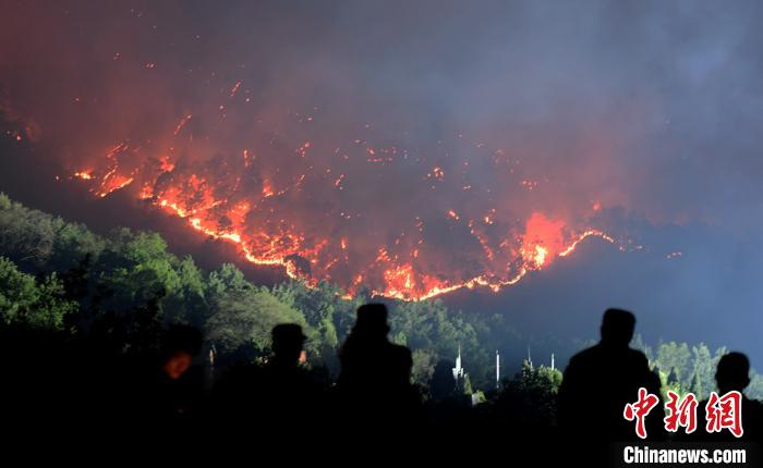 光福寺呈阶梯状依山而建,重重叠叠,平日香火极旺。记者拾级而上,抵达视野开阔的光福寺广场时,一回头,只见远处数公里长的火线在风中不断蔓延,过火区随之扩大。更高的山脊上,高耸的树冠不时轰燃,火舌腾起数十米高。