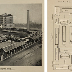 洛克菲勒研究所的战争示范医院鸟瞰图与战争示范医院设计图(1917年)