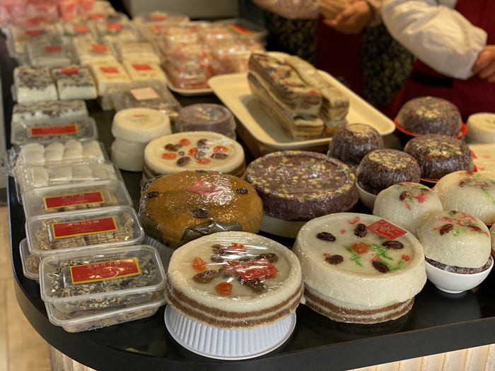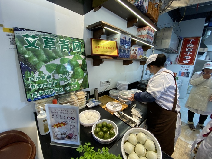 “七宝里弄”店堂内,方糕、海棠糕、塌饼、干蒸圆子还有刚出炉的艾草青团等人气小吃已全部回归。