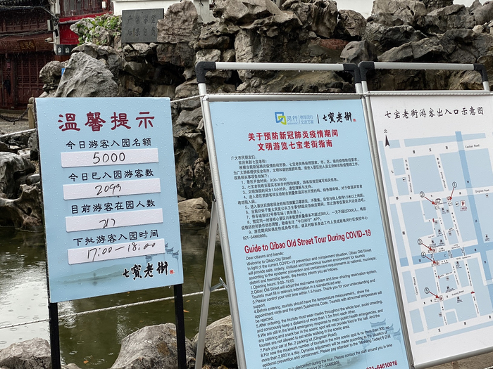 3月28日一早,七宝老街北入口处牌子上显示着前一天(27日)的入园人数2099人。