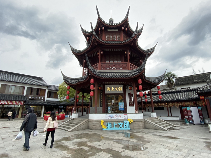 3月28日,下雨中的七宝老街牌坊,广场上的“七件宝”之一氽来钟钟楼,是开了几个月的“海上文创”七宝店。 (本文图片除署名外,均为澎湃新闻记者俞凯 图)