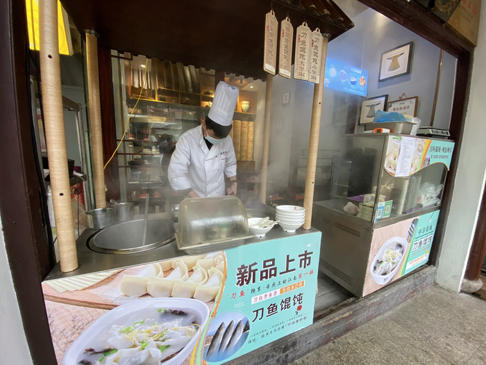 舌尖上的江南第一鲜——刀鱼馄饨小份20元(6个)、大份38元(12个)……在七宝老街连接北、南大街的古石桥——蒲汇塘桥桥口,“龙袍蟹黄汤包店”的王从刚师傅戴着口罩,正在沸水翻滚的大锅旁为食客下着刀鱼馄饨。
