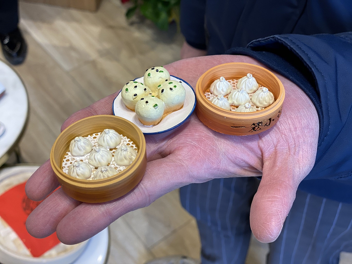 “海上文创”七宝店工作人员在展示义卖商品之一的小笼包造型树脂冰箱贴。