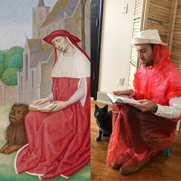 一位身穿红色雨披的男士重新演绎了16世纪的画作《圣杰罗姆在阅读》(Saint Jerome reading)