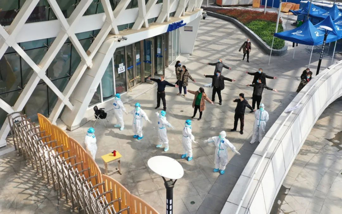 3月10日,在江夏方舱医院,医护人员教即将出舱的新冠肺炎治愈患者练习八段锦 才扬/摄杨发辉说,我国人口基数大,公共突发事件造成的心理危机涉及人群数量可能非常庞大。但究竟多少比例,需要什么程度与形式的心理干预,还要科学的调研实证支持。