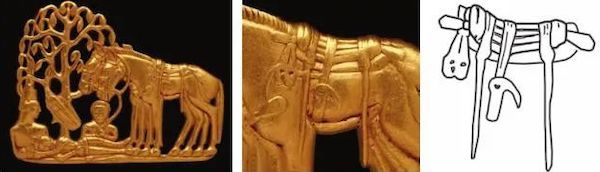以上的马鞍实物,年代集中在公元前5-4世纪。鲁金科指出,巴泽雷克式鞍的分布区域不仅包括亚洲草原的部落地区,还包括黑海地区的斯基泰文化区域。阿尔泰以外的其他区域虽缺乏实物遗存,但从带有马匹形象的遗物上可看到同类鞍具。例如,艾米塔什博物馆所藏的一件斯基泰文化金牌饰上有两匹鞍马形象(图一三:1),可以看出,马鞍表面有三根纵向的皮带,鞍垫上还有数道横向线,将其分割成条楞状。参考前述实物,我们不难判断,这些横向线是为了表现鞍垫上的绗缝痕迹。此外,马鞍上还装配有腹带、攀胸、后鞧,结构与巴泽雷克式鞍基本相同(图一三:2、3)。