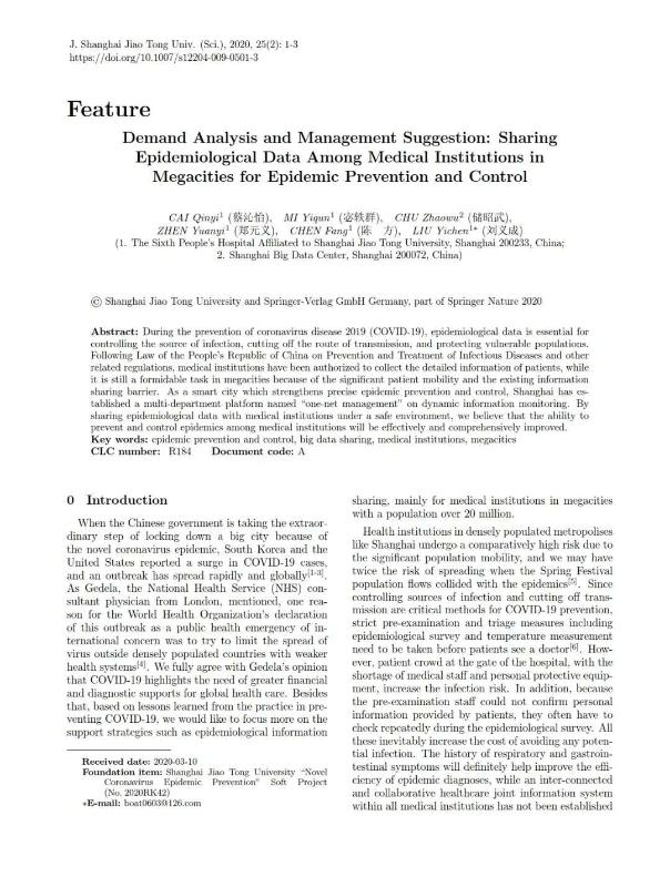 抗击疫情,共克时艰。这场新型冠状病毒大流行几乎触及我们生活的方方面面:如何控制感染源?上海这种超大城市如何防控?如何切断传播途径?何时考虑复工复学?怎样降低传染风险?为全力做好疫情防控工作,尽快反映抗击新冠肺炎疫情的创新性研究成果,《Journal of Shanghai Jiao Tong University (Science)》开设COVID-19防控专栏,以最快的速度为您提供最新论文,为打赢疫情防控阻击战提供科学依据。