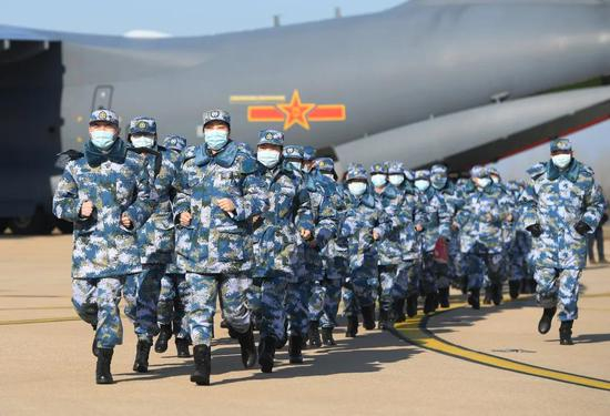 民航工作人员看到,身着各军种迷彩服的子弟兵们鱼贯出舱、迅速集结,他们左臂上的红十字标志分外醒目。