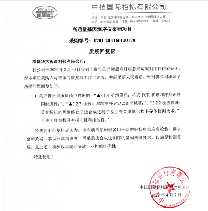 中技国际招标有限公司在给华大智造的质疑回复函中称:我公司于2020年3月30日收到了贵司关于标题项目应急采购谈判文件的质疑函,现本项目采购人与评审专家复核工作已完成,并经采购人同意后,针对贵公司质疑函提出问题回复。经谈判小组复核后认为,本次项目采购设备用于新型冠状病毒应急检测,要求全球数据共享以及高精确度,需采购边合成边测序的基因检测技术,以满足检测需要,且上述3项参数非废标条款,不构成排他性。
