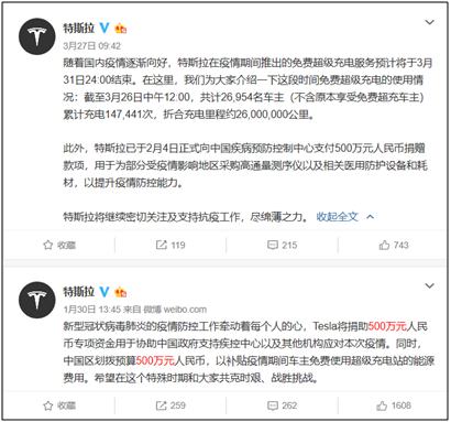 1月30日特斯拉在其官方微博发出公告,将捐款500万元人民币,用于支持疾控中心以及其他机构应对本次新型冠状病毒疫情。3月26日中国政府采购网发布招标公告(款项来源:自有资金,编号:0701-204160120170)。3月27日,特斯拉官微再次发布公告,表示其已于2月4日正式向中国疾病预防控制中心捐赠500万元人民币用于采购高通量测序仪。
