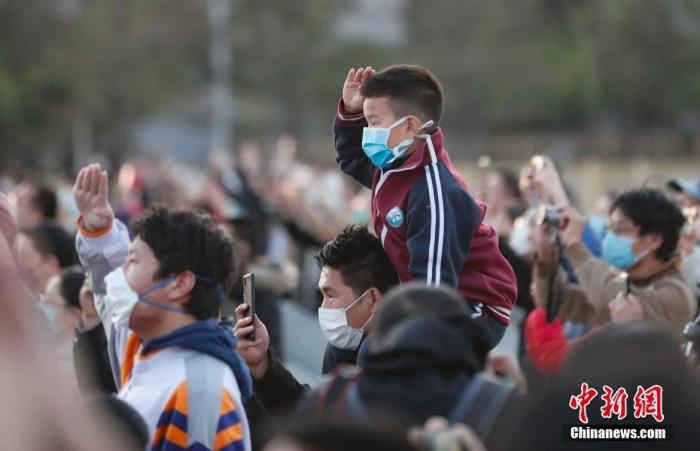 4月4日,北京天安门广场降下半旗,表达对抗击新冠肺炎疫情斗争牺牲烈士和逝世同胞的深切哀悼。图为参加升旗仪式的民众。 中新社记者 杜洋 摄