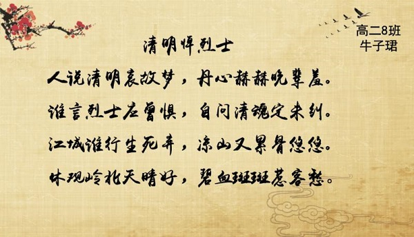 诗歌创作74份,跨时空“书信”172份,“云上场馆走访”小报165份……虽然并没有要求每名同学都要上交“作业”,但仍有不少同学主动通过各种形式将对烈士的崇敬和两个月来累积的对抗疫情英雄们的感动,付诸笔端。“承蒙烈士洒热血,记诵今朝又一年……”高二(3)班同学自发完成了一场网上视频接力,发起原创诗朗诵《英雄的黎明》。“曾有一盏灯,用自己的微光,撕破了暗夜的一角,又经过亲万人接力,才让这个世界薪火不灭……活在负重前行的人的背后,即使有不适应的学习环境,我们也应该越磨砺,越锋利。”高一(4)班印辰雨感叹。“朱少屏烈士面对生死抉择时,毅然选择以死捍卫国家尊严。“时至今日,战乱不再,然而这样的精神却永存心间。作为当代青少年,我们更应当将其发扬光大,带着崇敬之心尽自己的一份力。”高二(1)班汤真欢说。 “我们应该做的,便是把握当下时间,实现更美好的未来……未来拿稳接力棒,但祖国需要我们时,冲在第一线!”高二(6)班陈佳懿还特意在明信片上画上了微笑的太阳,“天气在一天天变暖,往后的日子都充满了希望。”