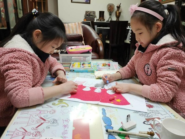 翟恒安和姚恒宁是一对双胞胎,姐妹俩一起用蜡笔合作了一幅《感恩有您》,医护、战士奋战抗“疫”一线,五星红旗的大背景充满力量。孩子们用画笔描绘有各行各业共同抗击疫情的前行者,讲述病毒被消灭的原创故事。