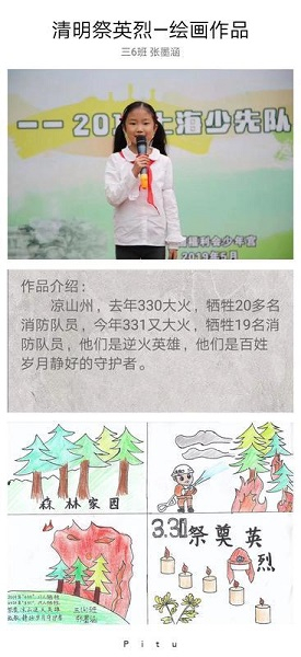 黄浦区卢湾一中心小学通过微信公众号举行了“清明祭英烈”系列学生作品展,同学们用朗诵英雄诗歌、手绘英烈事迹、书写英烈格言等方式,致敬英雄。三(6)班女孩张墨涵心中,英雄是新闻里看到的凉山大火中,逆行的身影。她用画笔记录下消防员叔叔的身影,画面中,失去主人的消防帽,静静地放在思念的蜡烛一旁。三(3)班刘彧彤的画作主角,是一位帅气的飞行员,那是为捍卫祖国领空,驾驶战机与美军侦察机相撞而牺牲的空军飞行员王伟。