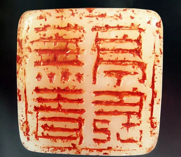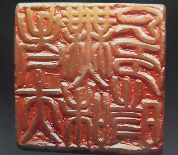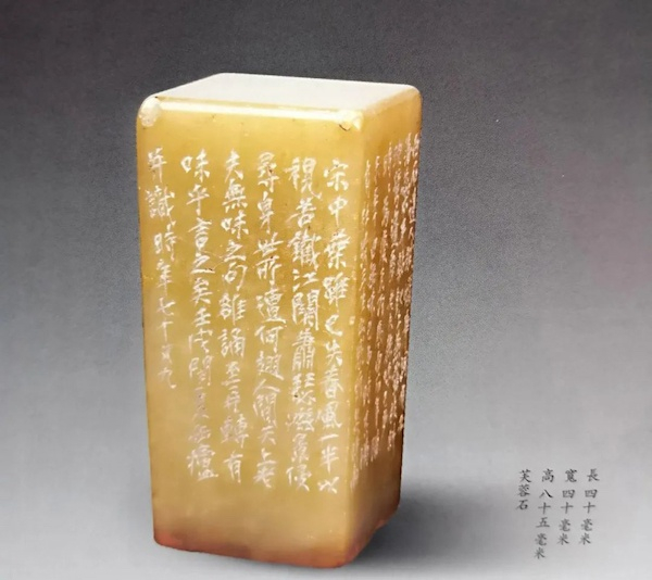 “虚素”印侧刻一座僧造像。其上部一横中刻有“榻穿能坐,偈持无堕,易筋经法师传我,老缶铭。”其印顶款,刻有“凡智与言,从虚素生,则无邪欲也。壬子立秋后三日,缶道人刻于扈。”在顶款文字中,对印面 “虚素”二字的含义作了阐述与申发。只有虚其心,方可得其智,只有朴素无华,则人品德行高尚,也是吴昌硕在艺术与为人上的座右铭,故刻石以自勉。