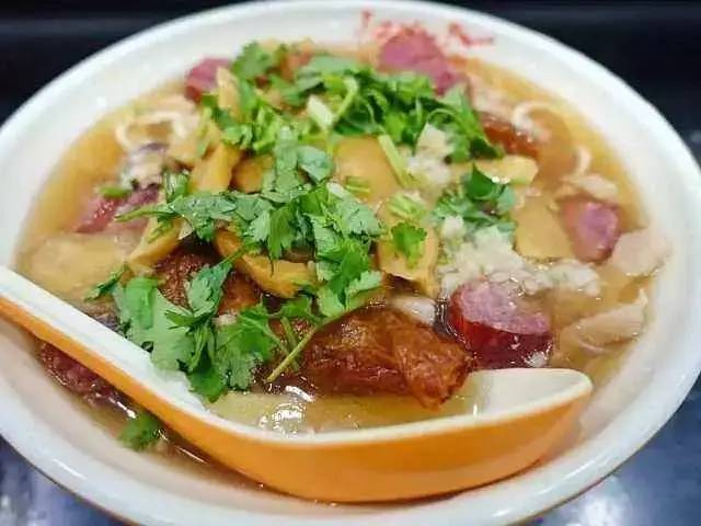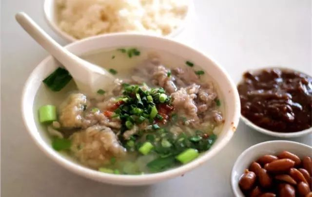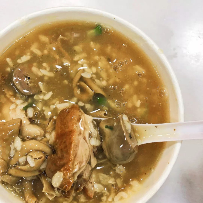 它不似广东粥的绵软,米粒还是粒粒分明,据说是鸭汤泡着大米一起熬煮的,所以粥底特别入味。店家一般会摆上十几种料,鸭肉、鸭心、小肠、猪肝沿……让食客可以自由选择。