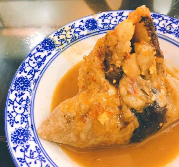 泉州肉粽里包有卤蛋、香菇、虾仁、三层肉、莲子、鱿鱼干和海蛎干,料超级足!吃的时候一定要拌上甜辣酱、蒜蓉和花生酱,清香醇美、不黏不腻,口感独特,令人回味无穷。