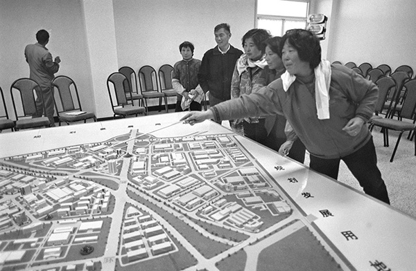 1993年1月,居民在看金桥出口加工区的规划模型。 新华社 资料图