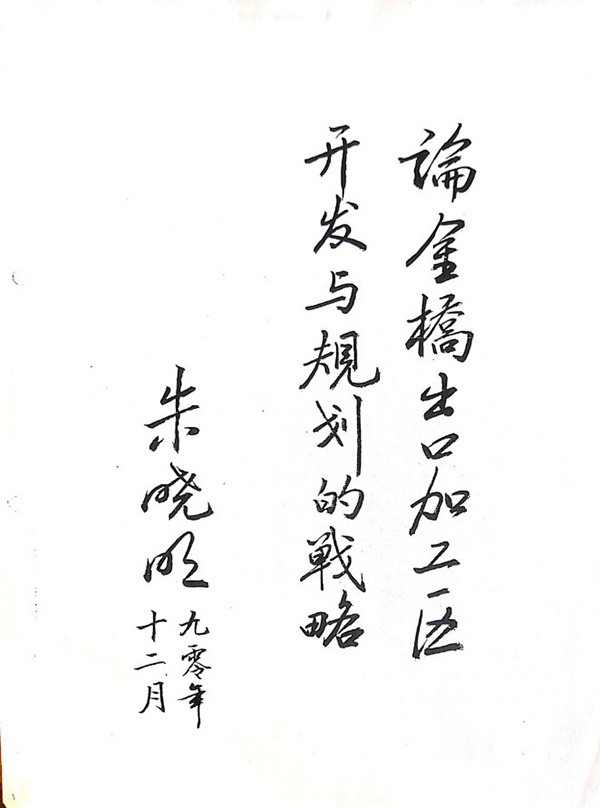 1990年12月,朱晓明撰写的《论金桥出口加工区开发与规划的战略》封面原稿实样。金桥开发区供图
