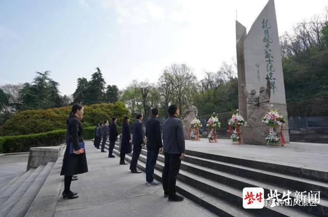 抗日航空烈士公墓,苍松翠柏环绕的烈士纪念碑庄严肃穆。9时30分许,凭吊活动开始,全体肃立,唱国歌,向抗日航空烈士敬献花圈、默哀并三鞠躬,表达对航空英烈的无限缅怀和敬仰。