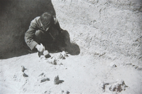 1980年,时任宁夏考古研究所所长的钟侃先生主持了对水洞沟第四次发掘,图中,钟侃先生正在宁夏灵武水洞沟某探方内作业,摄影师不详。