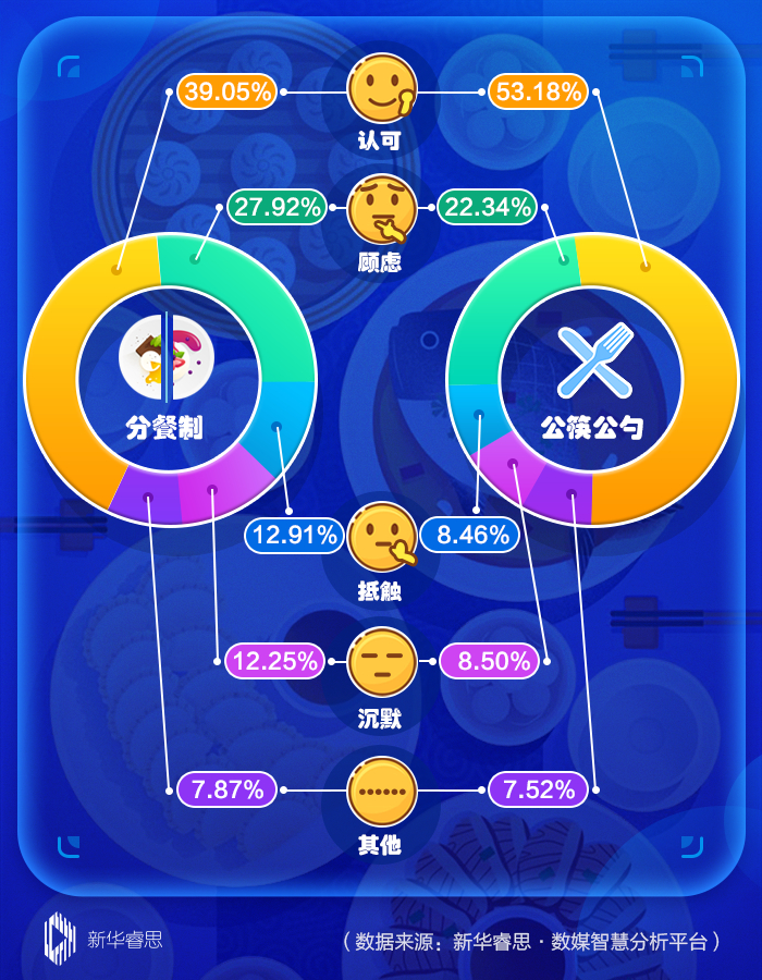 各地的呼吁倡议得到了网民的积极响应。多数网民对分餐制表示支持,有近40%的网友认同分餐制,超过50%的网友倾向于公筷公勺制,仅有一成左右的网友存在抵触心理。