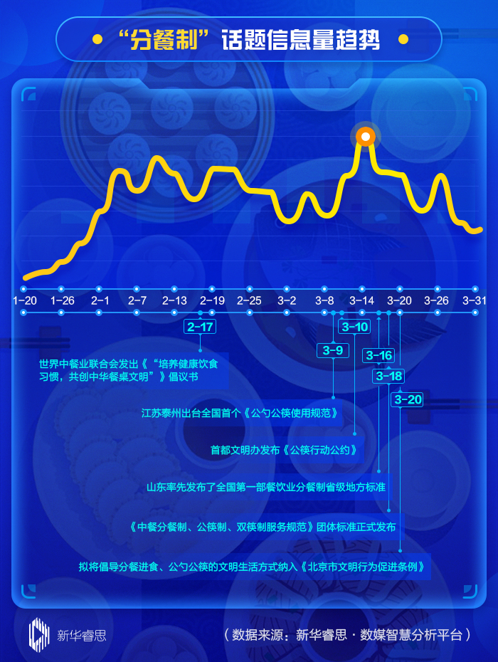 根据新华睿思·数媒智慧分析平台数据显示,在最近两个月来,关于分餐制话题的关注度不断上升,全国范围内信息量累计达到1039539条。其中,从话题趋势演变图看,3月14日达到舆论热度的首个峰值(30183条),这与北京、江苏泰州等地发布出台关于公筷使用的文件直接相关。