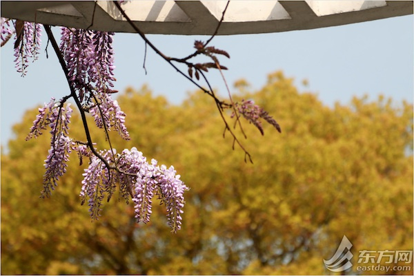 上海植物园的紫藤分布于游船码头和盆景园内,串串花序轻轻悬挂。