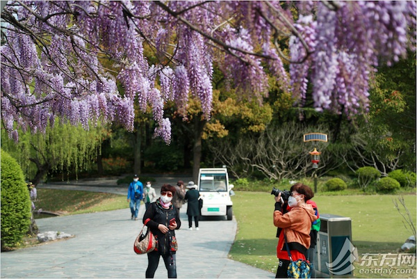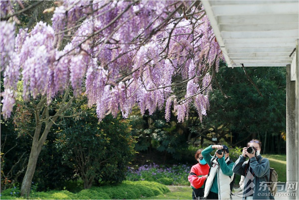 紫藤的花语是:“对你执着,最幸福的时刻”。每到4月紫藤烂漫的季节,便有浪漫的梦幻香气开始蔓延。在上海植物园,又到紫藤花开的季节,紫色稻穗般的枝条垂下,偶有微风拂过,满目摇曳。